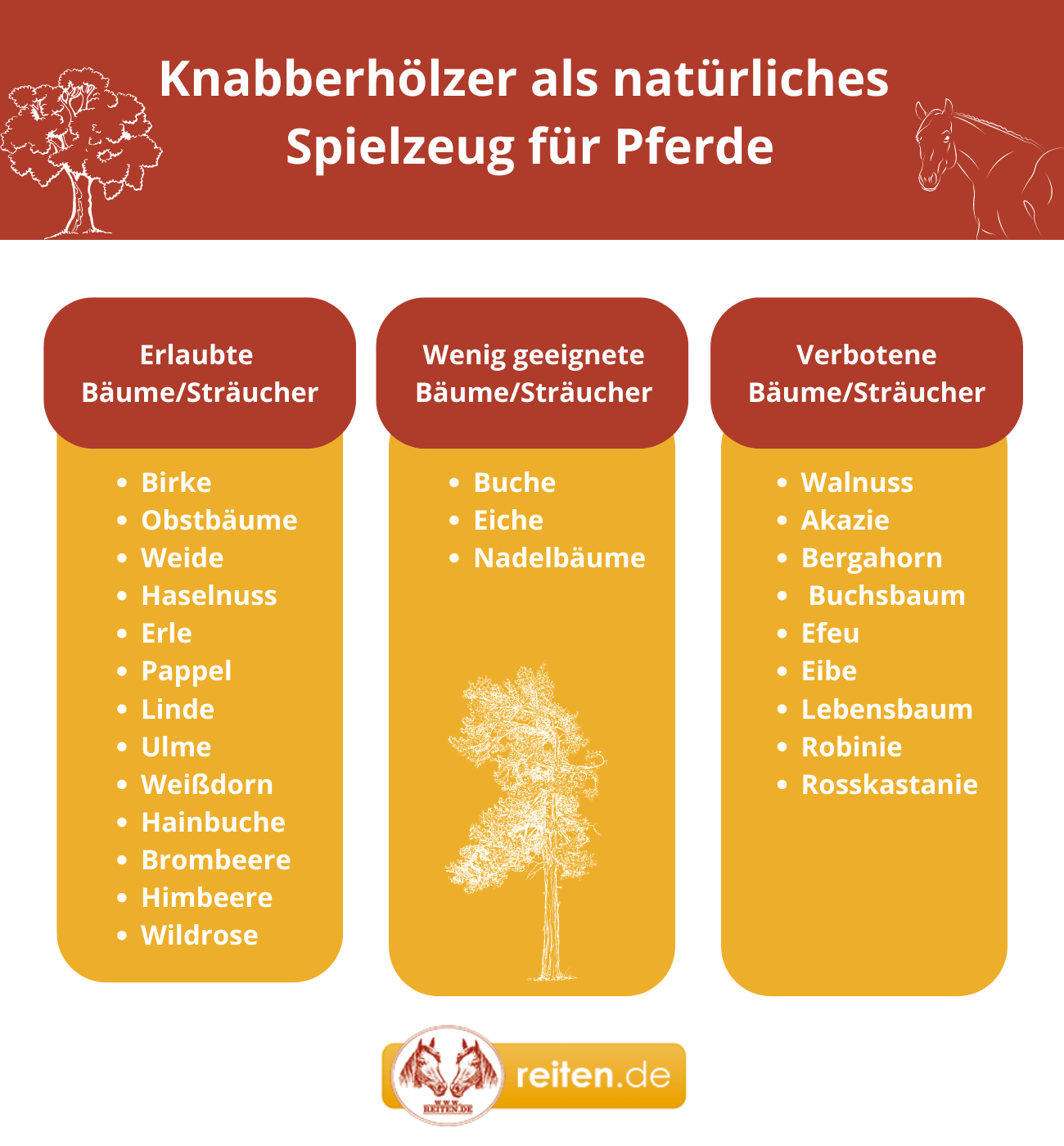 Deshalb eignen sich Knabberhölzer als Spielzeug für Hauspferde besonders gut. Pferdehalter sollten darauf achten, die richtigen Hölzer bereitzustellen. Denn es gibt Sträucher und Bäume, die giftig für Pferde sind und ihnen massiv schaden könnten.